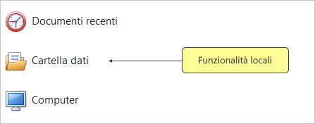 Documenti recenti: permette di selezionare uno degli ultimi dieci documenti apertiCartella dati: permette di aprire i documenti salvati della cartella dati di default (Percorso modificabile tramite la funzione della schedaStrumenti | Impostazioni | Opzioni)Computer: permette di aprire documenti salvati nella cartellaDocumentidi Windows