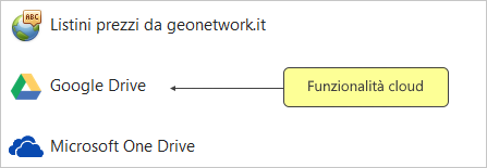Listini prezzi da geonetwork.it: permette di aprire tutti i listini prezzi disponibili sul sito Geo NetworkGoogle Drive: permette di aprire documenti dal servizio di cloud storage di Google (necessita di un account Google)Microsoft One Drive: permette di aprire documenti dal servizio di cloud storage di Microsoft (necessita di un account Microsoft Windows live)Dropbox: permette di aprire documenti dal servizio di cloud storage dropbox (necessita di un account Dropbox)Spazio FTP: permette di aprire documenti precedentemente salvati su spazi web personali (es. sito internet dello studio, webspace compreso nell'abbonamento ADSL, spazio gratuito messo a disposizione da altri provider)