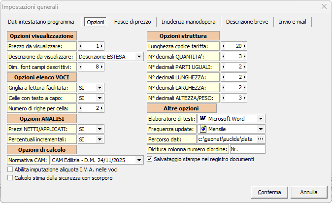 Il campo Normativa CAM riveste un'importanza fondamentale, poiché consente di selezionare, tramite un menu a tendina, la normativa CAM di riferimento che Euclide Computo & Contabilità applicherà a tutti i documenti creati successivamente. La modifica della normativa ha effetto su tutti i nuovi documenti solo se effettuata in assenza di documenti aperti; in caso contrario, la variazione verrà applicata solo ed esclusivamente al documento attivo.