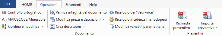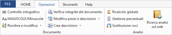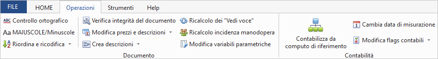 Le funzioni disponibili nella scheda Operazioni sono suddivise in operazioni comuni (sezione Documento) ed altre funzioni disponibili soltanto sulla base della tipologia del documento attivo (sezione Analisi per i listini prezzi, sezione Preventivi per i computi metrici e sezione Contabilità per le contabilità dei lavori).