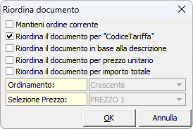 Riordina documento permette la gestione ordinata (crescente/decrescente) del documento a seconda di particolari campi.