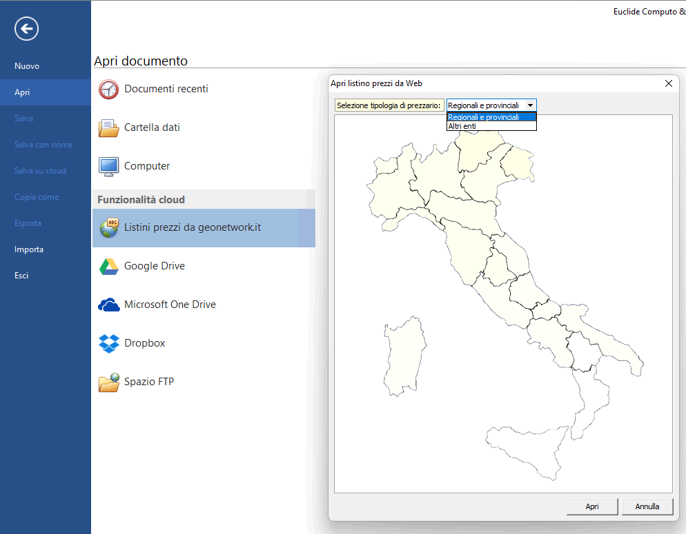 Cliccando sulla cartina verranno mostrati i prezzari regionali e provinciali disponibili per la regione selezionata. I prezzari non direttamente collegati ad una specifica zona verranno visualizzati selezionando l'opzione Selezione tipologia di prezzario | Altri enti