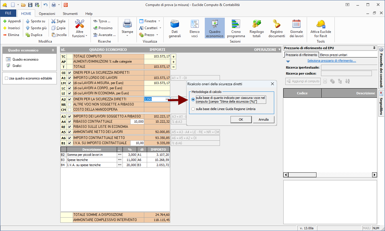 Il totale degli oneri per la sicurezza diretti può essere imputato direttamente dal tecnico, oppure richiamando automaticamente il valore calcolato della stima, tramite il pulsante contraddistinto da tre puntini presente nel campo.
