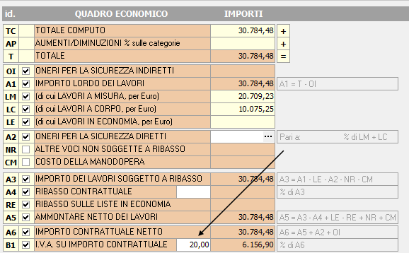 Per la prima modalità, bisogna indicare l'aliquota IVA nel Quadro economico alla casella B1 - IVA SU IMPORTO CONTRATTUALE.