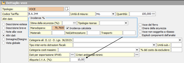 All'interno dell'Elenco voci, pagina Altri dati, bisogna indicare l'aliquota IVA per la voce selezionata (campo Aliquota IVA %).
