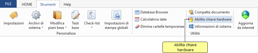 La funzione Abilita chiave hardware, accessibile dal menu principale Strumenti, consente di abilitare la chiave hardware direttamente dal programma, qualora sia già installato ed abilitato un altro software della suite Euclide che utilizza la stessa tipologia di chiave.