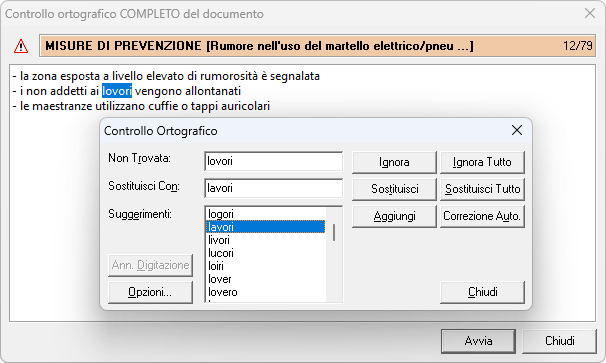 Nell'esempio mostrato in figura, la funzione rileva la parola lovori come errata e propone un elenco di possibili correzioni (in questo caso la parola corretta è lavori).