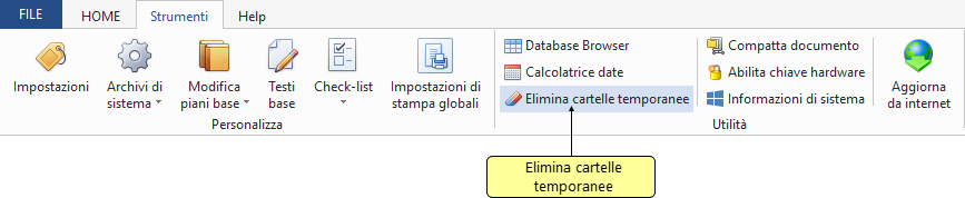 La funzione Elimina cartelle temporanee, accessibile dal menu principale Strumenti, permette di eliminare il contenuto della cartella temporanea di Euclide Sicurezza Cantieri (solitamente C:\geonet\Euclide494\TEMP).