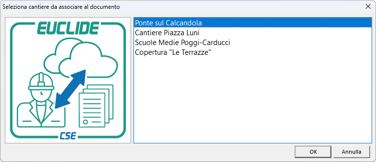 Questa funzione rappresenta il primo passo per il collegamento con l'applicazione web, consente infatti di associare la pratica attualmente in uso a un cantiere già presente in Euclide CSE.