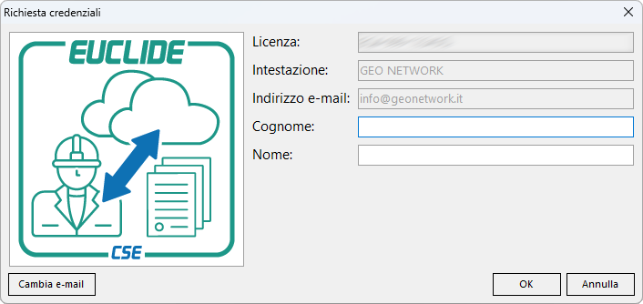 La funzione permette di richiedere le credenziali per l'accesso a Euclide CSE, essendo la licenza nominativa, dovranno essere inseriti cognome e nome. L'e-mail proposta è quella digitata al momento della registrazione della licenza d'uso. Nel caso si desiderasse cambiarla (o se per qualche motivo risultasse non inserita) premere il pulsante Cambia e-mail.