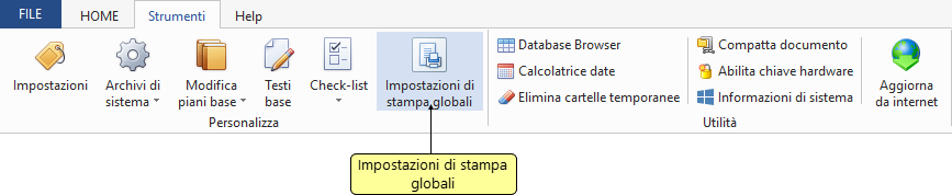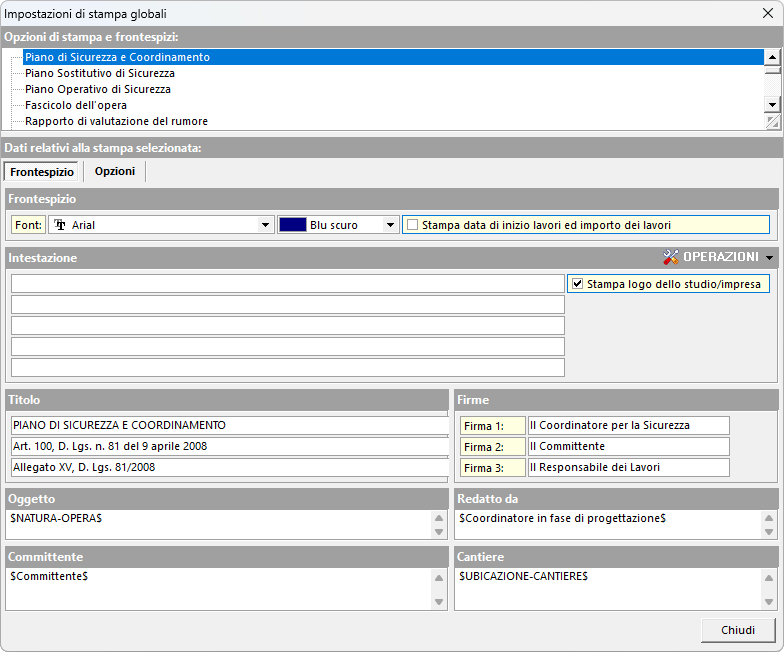La funzione Impostazioni di stampa globali, disponibile dal menu principale Strumenti, permette di modificare le impostazioni generali ed i frontespizi delle principali stampe effettuate da Euclide Sicurezza Cantieri.