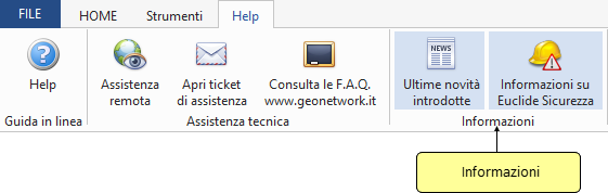Ultime novità introdotte: permette di accedere alla pagina del sito Geo Network, dove è disponibile l'elenco completo di tutte le versioni di Euclide Sicurezza CantieriInformazioni su Euclide: permette di visualizzare le informazioni del programma, come versione e build