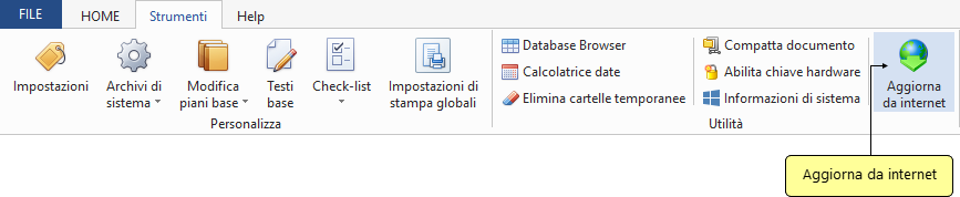 La funzione di Aggiorna da internet, accessibile dal menu principale Strumenti, consente di verificare la disponibilità di eventuali aggiornamenti del programma.