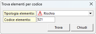 Il comando consente di cercare un elemento selezionando la tipologia e il relativo codice, come mostrato in figura.
