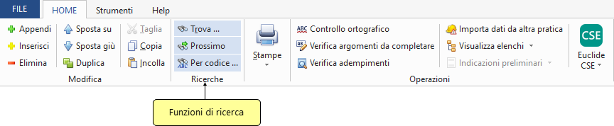 Grazie alle diverse modalità di ricerca, è possibile trovare rapidamente descrizioni, codici o altri contenuti, ottimizzando il flusso di lavoro e riducendo i tempi di navigazione tra le varie sezioni del software.