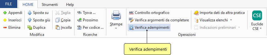 Il comando Verifica adempimenti, disponibile dal menu principale HOME, consente di controllare ed evidenziare la presenza di adempimenti obbligatori previsti dalla normativa.