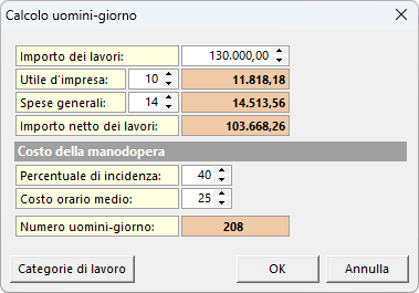 L'entità presunta può essere inserita manualmente oppure calcolata dal programma. Il pulsante con l'icona dei tre puntini, situato accanto al campo Entità presunta dei lavori (uomini-giorno), consente di accedere alla schermata per il calcolo dettagliato degli uomini-giorno.
