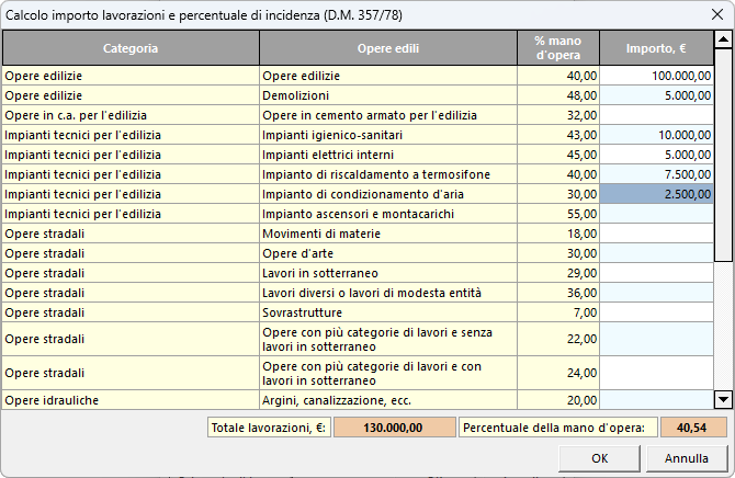 Il pulsante Categorie di lavoro, permette di calcolare la percentuale di incidenza della mano d'opera inserendo gli importi delle singole categorie di lavori secondo la tabella prevista dal D.M. 357/78.
