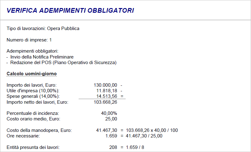 Di seguito viene illustrato come il software calcola l'entità presunta del cantiere, utilizzando i dati inseriti come mostrato nelle immagini.