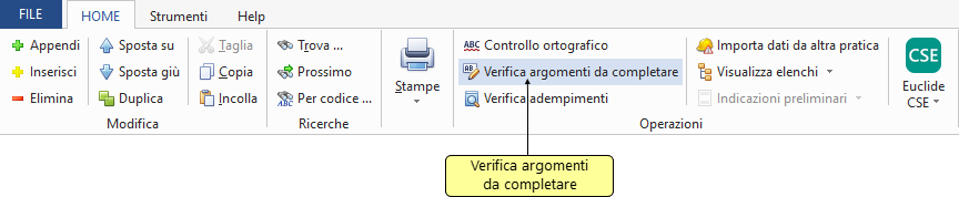 Il comando Verifica argomenti da completare, disponibile dal menu principale HOME, consente di controllare ed evidenziare le sezioni della pratica che devono ancora essere esaminate o completate per finalizzare la redazione del documento.