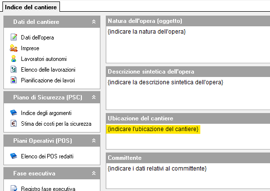 Il programma analizzerà la pratica individuando tutti i campi da completare, riconoscendo come tali quelli il cui contenuto è racchiuso tra parentesi graffe, ad esempio: {indicare l'ubicazione del cantiere}.