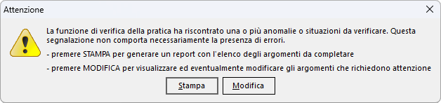 Analogamente alla funzione di verifica automatica della pratica, premendo il tasto Modifica è possibile visualizzare l'elenco degli argomenti che richiedono un intervento e aggiornarli direttamente.