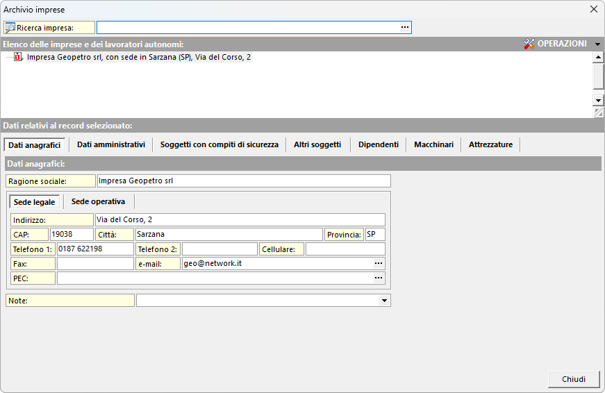 In questo archivio è possibile inserire i dati di tutte le imprese e dei lavoratori autonomi con cui si collabora più frequentemente, così da averli sempre disponibili e utilizzabili nelle varie sezioni del programma.