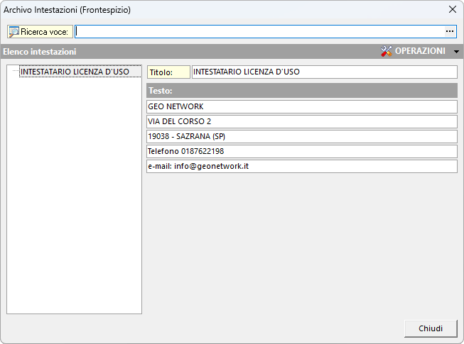 L'archivio intestazioni consente di gestire differenti intestazioni utente (in aggiunta ad INTESTATARIO LICENZA D'USO) da indicare nei frontespizi dei documenti.