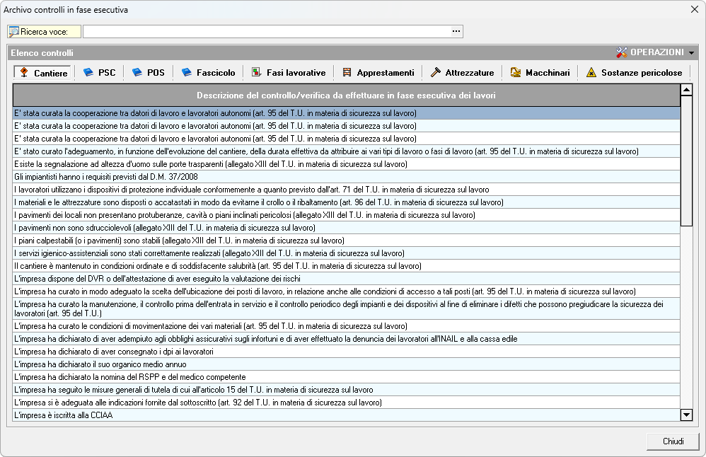 Questo archivio raccoglie i controlli e le verifiche aggiuntive rispetto a quanto previsto dalle misure preventive e protettive di ciascun rischio, con riferimento a: