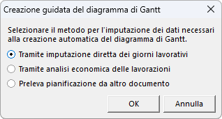 La prima volta che si accede alla pagina Pianificazione dei lavori, Euclide Sicurezza Cantieri permette di avviare la creazione guidata del Gantt, attraverso tre metodologie: