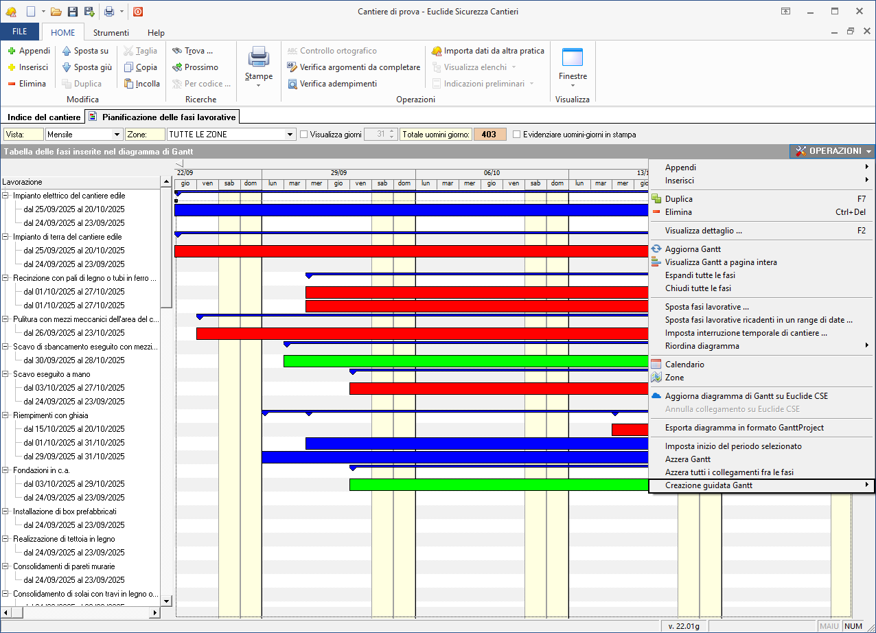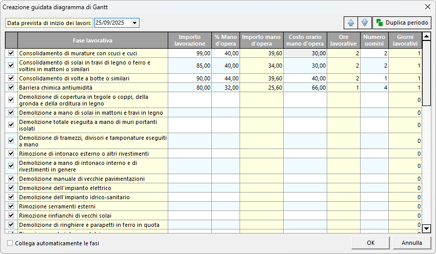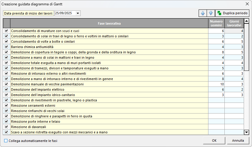 Sposta su / Sposta giù: cambia l'ordine delle fasiDuplica periodo: duplica la lavorazione selezionata creando un nuovo periodo (utile, ad esempio, per lavorazioni ripetute in zone diverse del cantiere, in periodi diversi)Collega automaticamente le fasi: flag che, se selezionato, consente di generare un diagramma di Gantt in cui tutte le fasi sono collegate in modo sequenziale: di conseguenza, spostando la prima fase di un certo numero di giorni, anche tutte le fasi successive verranno automaticamente aggiornate con lo stesso scostamento.