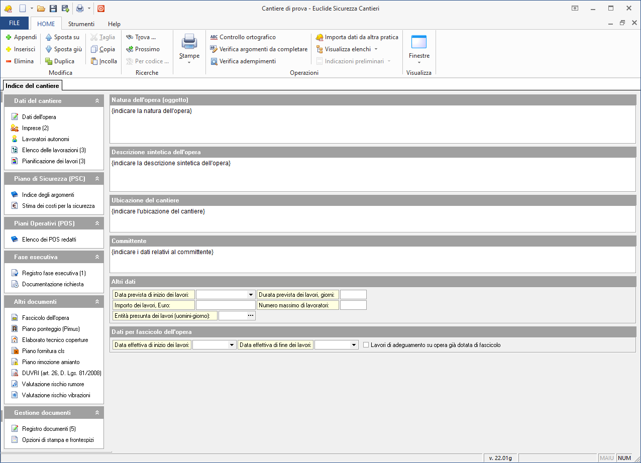 I campi testuali di questa sezione e dell'indice degli argomenti, quando non compilati, contengono un testo racchiuso tra due parentesi graffe, come ad esempio: {indicare l'ubicazione del cantiere}.