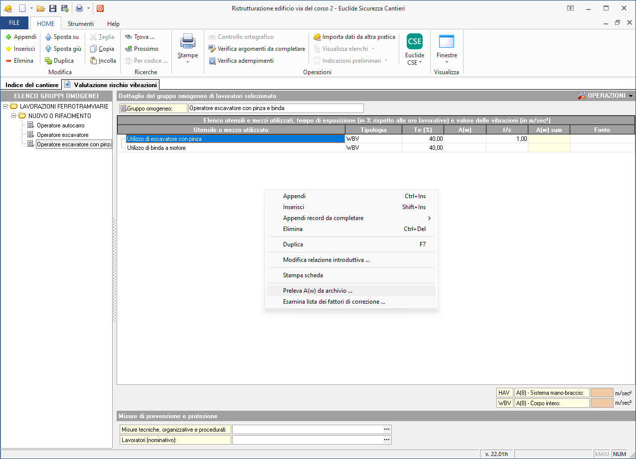 Nell'esempio riportato, il valore di accelerazione dell'utensile selezionato viene reperito tramite la funzione Preleva A(w) da archivio, disponibile sia nel menu contestuale accessibile tramite il tasto destro del mouse, sia nel pulsante OPERAZIONI. Il dato è prelevato direttamente dalla banca dati ISPESL.
