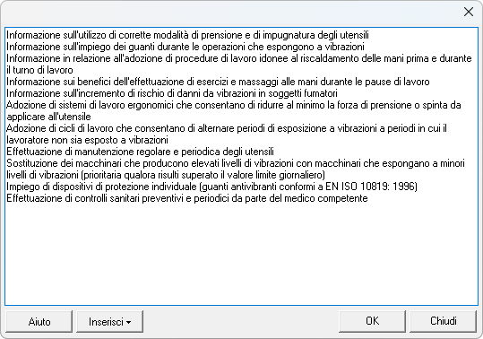 Nel caso di superamento dei livelli di azione giornaliero dovranno essere indicate tutte le misure tecniche, organizzative e procedurali necessarie, alcune delle quali possono essere inserite in automatico dal programma tramite l'apposito pulsante accanto al campo Misure tecniche, organizzative e procedurali che si trova in basso nella sezione Misure di prevenzione e protezione.