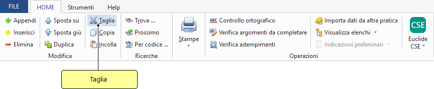 Il comando Taglia consente di copiare nel blocco degli appunti il testo selezionato all'interno di un campo, cancellandolo contemporaneamente.