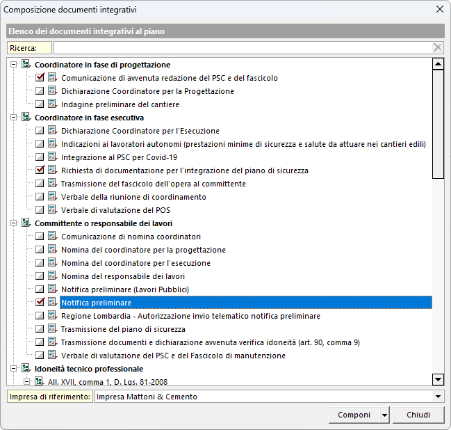 Sarà quindi sufficiente selezionare uno o più documenti e avviare la composizione cliccando sul pulsante Componi, dove sono presenti le due funzioni seguenti: