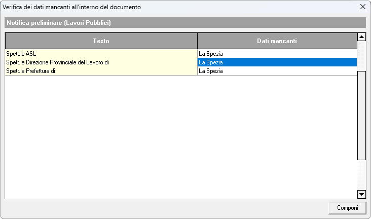 Componi, avvia la semplice composizione del documento sostituendo le variabili presenti con i relativi campi dati del programmaVerifica dati mancanti e componi, prima di avviare la composizione del documento (come da funzione precedente), verifica la presenza di dati mancanti (identificati dal tag #DATI-MANCANTI#) e tramite un'apposita finestra di dialogo ne permette la modifica.