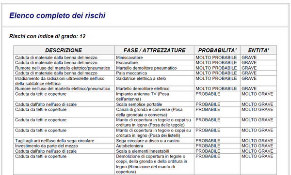 I rischi sono elencati con indice di grado in ordine decrescente e per ognuno è presente una breve descrizione, la fase/attrezzature che lo provocano, la probabilità e l'entità del danno.