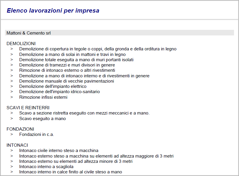 Elenco delle lavorazioni suddivise per impresa