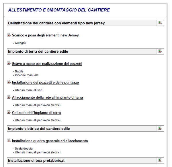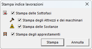 Prima di avviare la stampa, verrà visualizzata la finestra "Stampa indice lavorazioni", nella quale sarà possibile scegliere se includere nella stampa le sottofasi, gli attrezzi, i macchinari e le sostanze pericolose (le seguenti voci potranno essere incluse selezionando l'opzione Stampa delle sottofasi). È inoltre possibile decidere se includere anche gli apprestamenti.