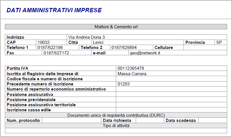 Questa funzionalità consente di stampare i dati amministrativi delle imprese coinvolte, comprendenti le informazioni anagrafiche, fiscali e documentali necessarie alla gestione del cantiere.