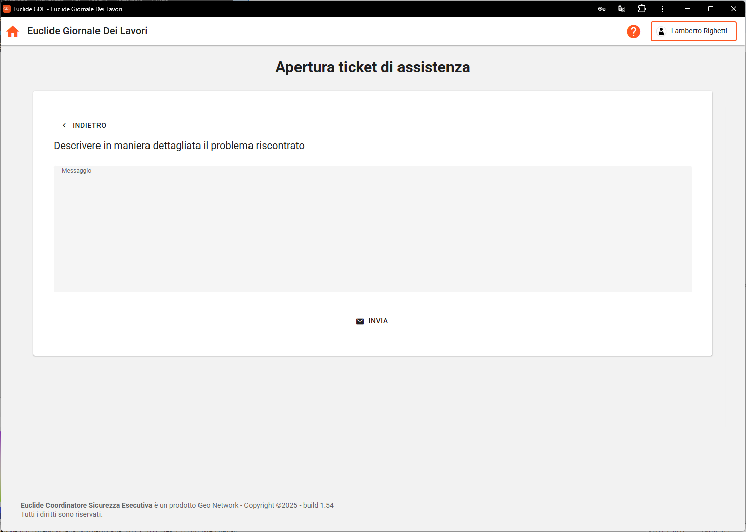 Euclide Giornale dei Lavori permette di richiedere assistenza tecnica relativa a problemi riscontrati con l'applicazione, attraverso l'apposita funzione Apri un ticket del menu ?.