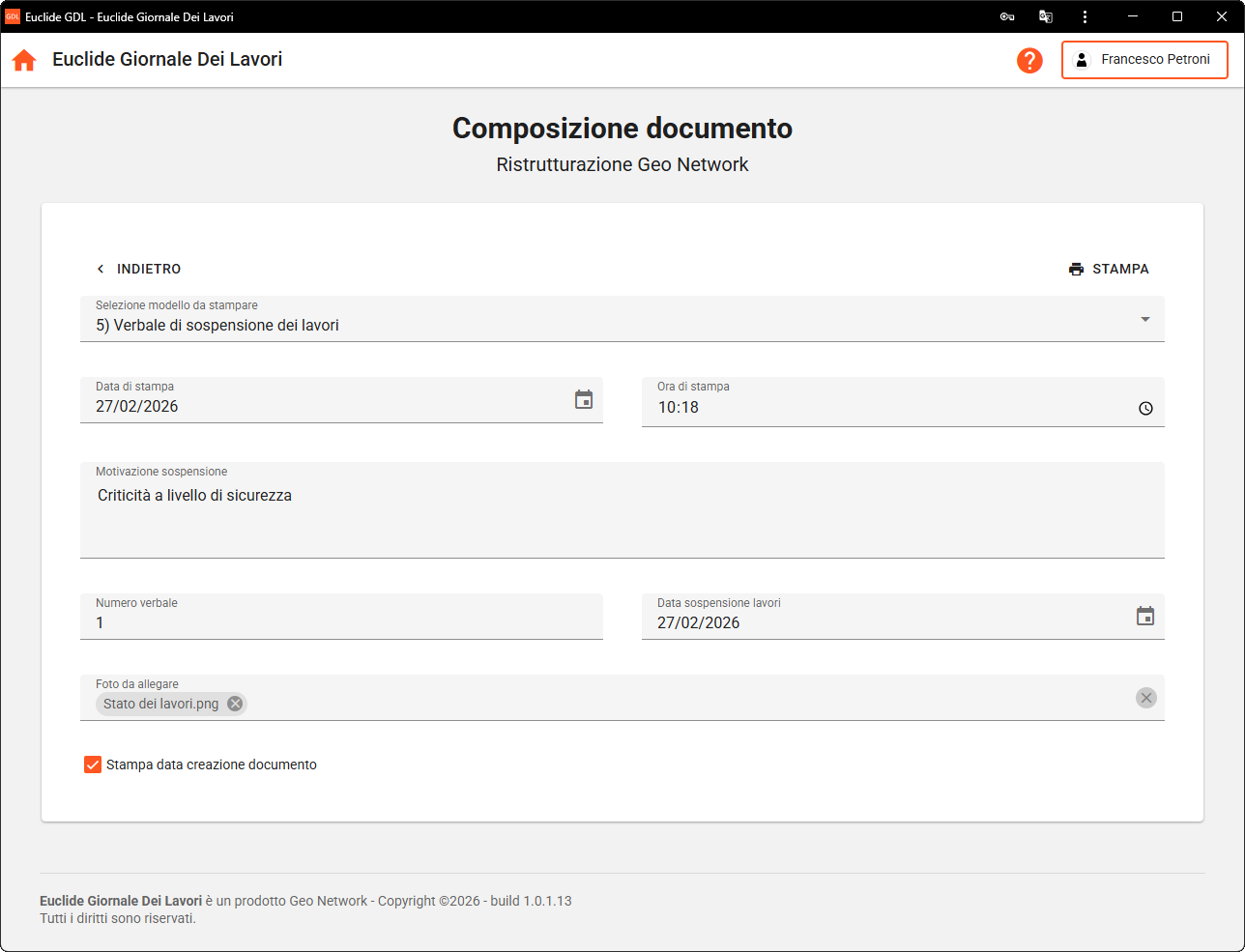 Documenti, eventi ed osservazioni|Composizione documento: aggiunto il campoFoto da allegare, attraverso il quale è possibile richiamare le fotografie precedentemente caricate nella sezione Documentazione fotografica. Le immagini selezionate verranno stampate nel verbale scelto.Giornale dei Lavori | Sezione