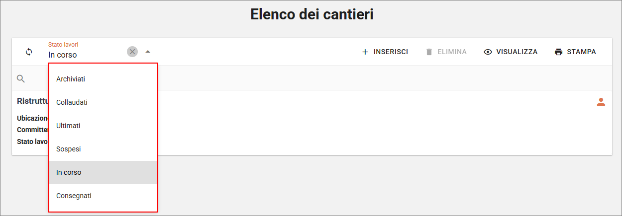 Elenco dei cantieri: è stato aggiunto il campoStato lavoriche permette di filtrare i cantieri sulla base dello stato dei lavori (Archiviati,Collaudati,Ultimati,Sospesi,In corso,Consegnati).