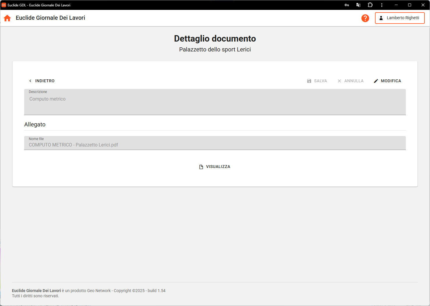 | Permette di tornare alla precedente pagina di Euclide Giornale dei Lavori, nella fattispecie all'elenco dei documenti di cantiere | |