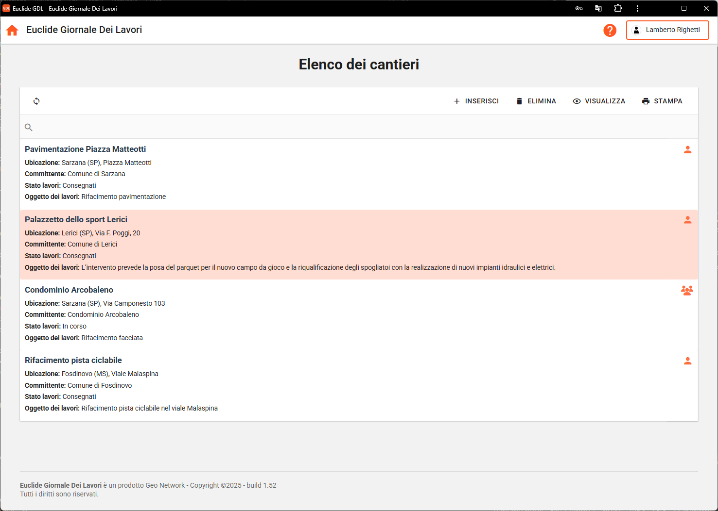 Una volta effettuato correttamente il login alla piattaforma Euclide Giornale dei Lavori, l'utente viene reindirizzato alla pagina iniziale dell'applicazione, dove viene visualizzato l'elenco completo dei cantieri a cui è associato.