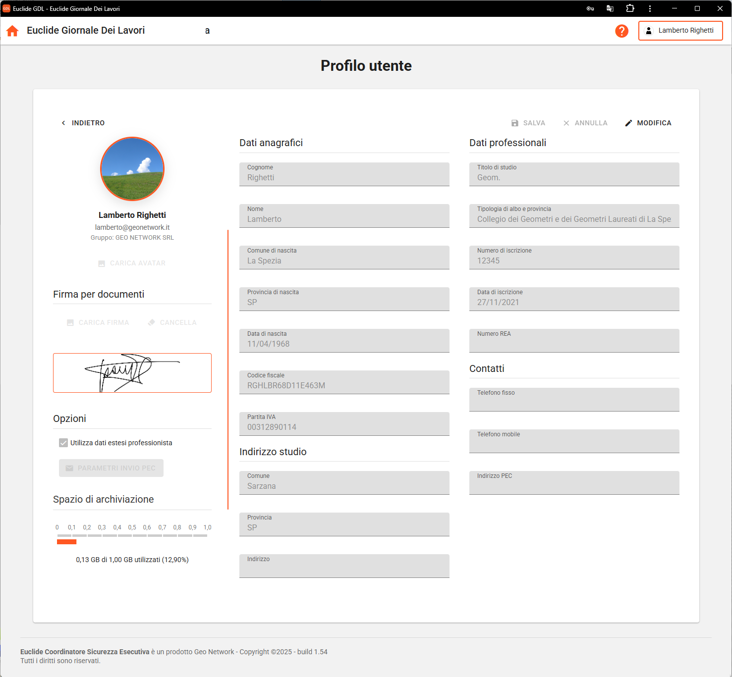 Questa sezione mostra una panoramica completa dei dati identificativi, professionali e di contatto dell'utente attualmente connesso ad Euclide Giornale dei Lavori.