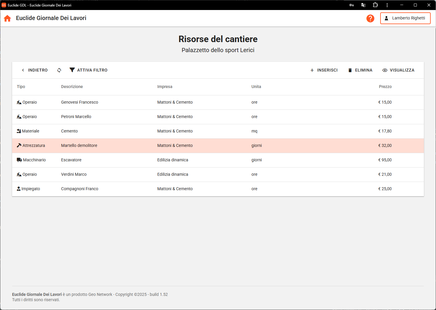 Questa sezione consente di gestire l'elenco delle risorse del cantiere, suddivise per tipo (operai, materiali, attrezzature, impiegati, macchinari, ecc.), ed è utilizzata per compilare o aggiornare il Giornale dei Lavori.