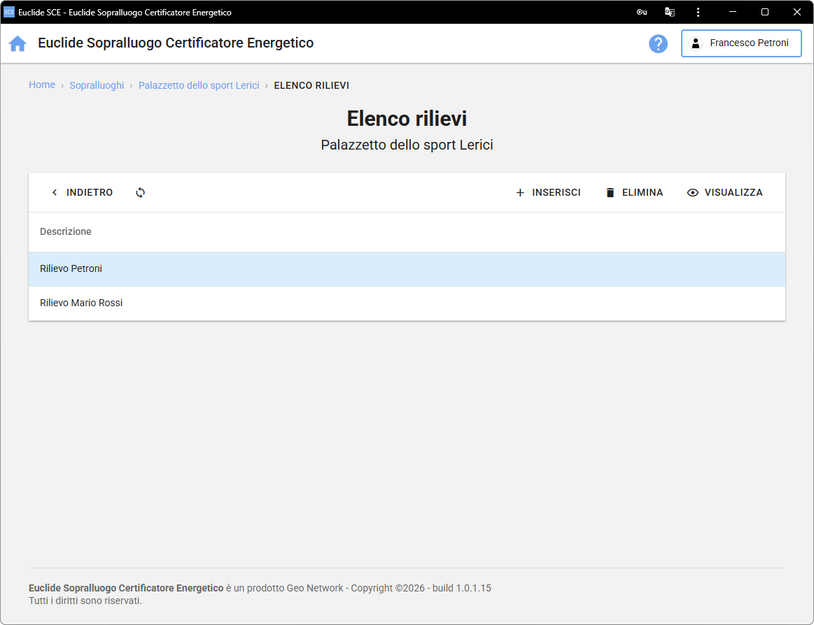 | Consente di tornare alla precedente pagina di Euclide SCE, nella fattispecie alla Sezione Elenco rilievi. | |