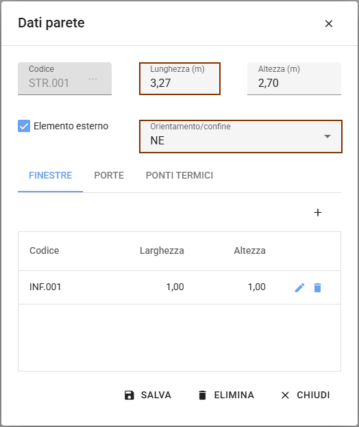 Una volta verificati ed eventualmente modificati i dati, premendo il pulsante Salva la parete verrà evidenziata con colori differenti in base all'orientamento o al tipo di confine: